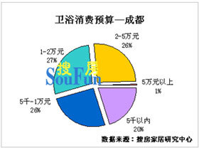 調(diào)查顯示,成都地區(qū)消費(fèi)者在衛(wèi)浴裝修預(yù)算方面的分布比較均勻,除5萬(wàn)元以上預(yù)算消費(fèi)者僅占1%,其他預(yù)算區(qū)間比例均在20%以上,呈四分天下格局。其中,1-2萬(wàn)元預(yù)算消費(fèi)者占比稍高,為27%,5千以內(nèi)消費(fèi)者最少,占20%,預(yù)算在5千-1萬(wàn)及2-5萬(wàn)元的消費(fèi)者均占26%,并且,與其他主要城市相比,成都地區(qū)高預(yù)算消費(fèi)者明顯位居高位,高于其他城市10-20個(gè)百分點(diǎn)。