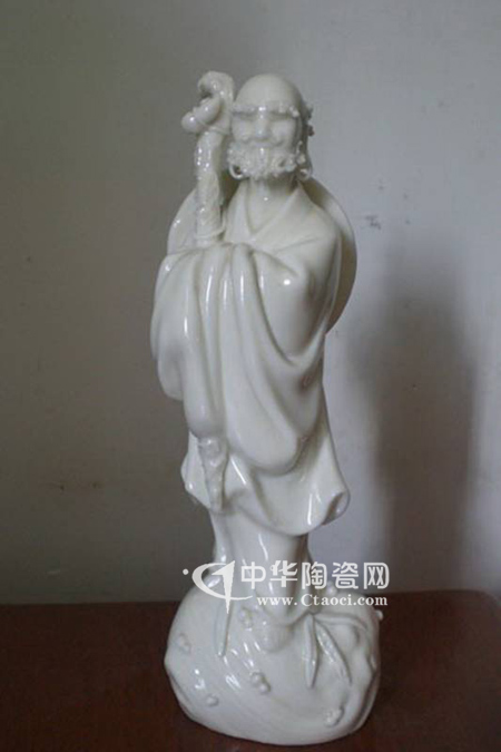 其次,因其產(chǎn)生的那個(gè)特殊年代,瓷泥都是源于德化本地優(yōu)質(zhì)的高嶺土,在制作工藝、造型、繪制等方面均非常精致,就其藝術(shù)價(jià)值來(lái)說(shuō),它并不比清三代的官窯瓷器遜色。這一尊《達(dá)摩》,系由中國(guó)工藝美術(shù)大師陳其泰所創(chuàng)作。作品整體造型和諧、豐滿,細(xì)看胎質(zhì)細(xì)膩,如脂似玉,瑩潤(rùn)如水,線條優(yōu)美柔和。那衣褶自然,遒勁圓潤(rùn)、深淺得宜,富有節(jié)奏感,似臨風(fēng)飄拂,顯得靜中有動(dòng),臉部神情刻畫得栩栩如生,極為傳神,展示出了創(chuàng)作者高超的藝術(shù)造詣。