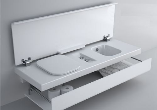 Hatria的G Full水池是一個(gè)創(chuàng)新的衛(wèi)浴解決方案,它將許多不同的功能都整合于一身,除了傳統(tǒng)的洗手池和深的洗衣盆外,它還包括了置物擱板、儲(chǔ)物柜,上面的擋板放下來(lái),它甚至就變成了一條長(zhǎng)凳。