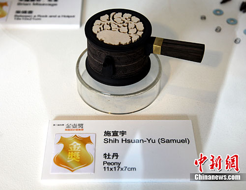 11月2日,第三屆臺灣金壺獎陶藝設(shè)計競賽展近日在臺北縣鶯歌鎮(zhèn)陶瓷博物館開幕。圖為展出的金獎茶壺。