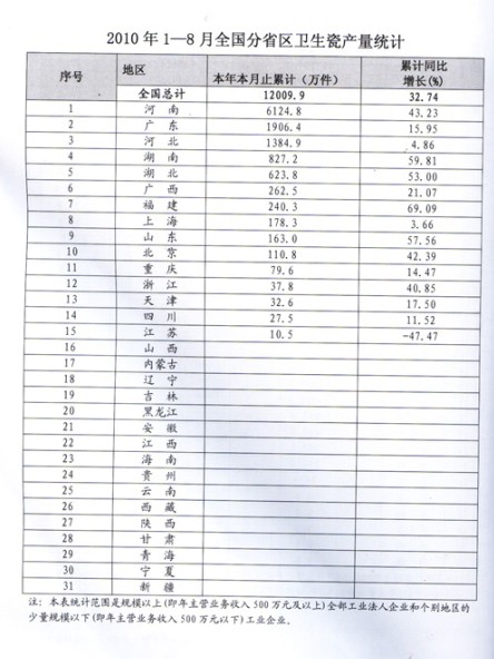 2010年1—8月全國分省區(qū)衛(wèi)生瓷產(chǎn)量統(tǒng)計