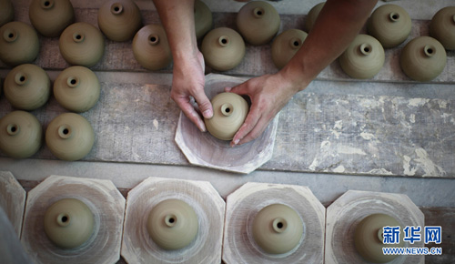 在鶯歌鎮(zhèn)的一個陶藝工作室里,制陶師傅蔡青峰在整理已經(jīng)干燥的陶坯。