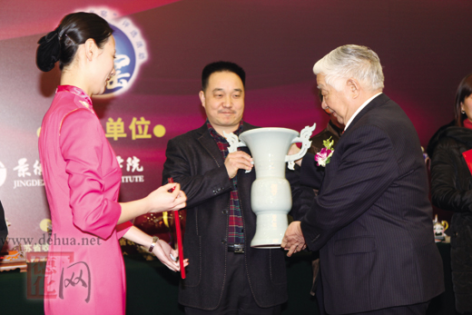 原全國(guó)政協(xié)副主席王文元向“當(dāng)代十大名窯”獲獎(jiǎng)?wù)咧袊?guó)白陳仁海頒獎(jiǎng)