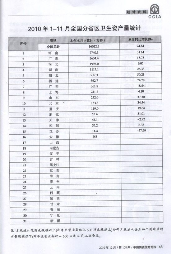 2010年1-11月份全國分省區(qū)衛(wèi)生瓷產(chǎn)量統(tǒng)計