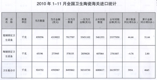 2010年1-11月全國衛(wèi)生陶瓷海關(guān)進(jìn)口統(tǒng)計(jì)