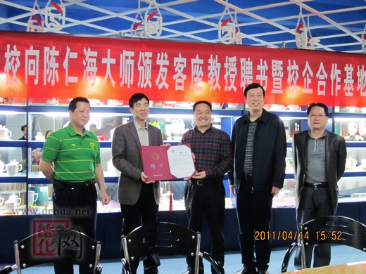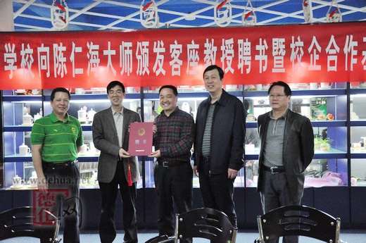 4月14日下午,福建商業(yè)高等專科學(xué)校向陳仁海大師頒發(fā)客座教授聘書暨校企合作基地授牌儀式在“中國白”藝術(shù)宮舉行。陳仁海大師應(yīng)福建商業(yè)高等?茖W(xué)校之邀,接受該校頒聘客座教授聘書。