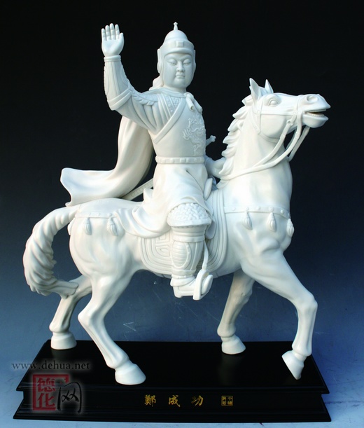 該作品長34cm,寬20cm,42cm。以戴盔、披甲、著袍、佩劍、騎馬的威武、神圣的形象,充分顯示統(tǒng)帥風度,從一個歷史人物逐漸成長為中華民族遙遙相望的英雄。作品采用德化特有的優(yōu)質高嶺土結合高級工藝美術師廣闊的思路,運用其獨特的藝術手法刻畫出一代圣人的神韻。榮獲“第八屆中國工藝美術博覽會暨古典家具、收藏品博覽會”“中藝杯”優(yōu)秀作品評比金獎。