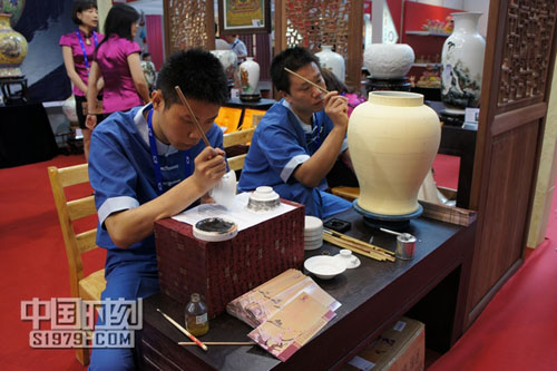 在第七屆文博會非物質(zhì)文化館,景德鎮(zhèn)陶瓷展示區(qū)不但有制作精湛的瓷器欣賞,還有工作人員進(jìn)行現(xiàn)場表演。