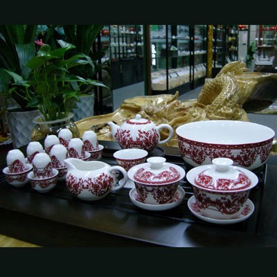 上圖為一套玉瓷手工繪畫制作的茶具,茶具上手工繪有中國民間剪紙風格的圖案,圖案精細,惟妙惟肖。茶具設(shè)計花紋討巧,既包容江南傳統(tǒng)的溫婉細膩的風格,又結(jié)合中國人大方高雅的傳統(tǒng)。