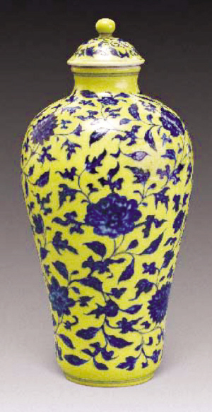 黃釉彩瓷在此時(shí)期也有了較高水平的發(fā)展,特別是仿明弘治的黃釉青花花果盤、檸檬黃釉青花瓷器、雞油黃釉綠彩器和少量的黃釉粉彩器。這些器物雖然數(shù)量不多,但是極具收藏價(jià)值,在每次拍賣中都有不俗的表現(xiàn)。