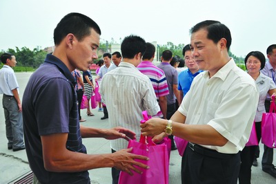 區(qū)委書記黎意勇向工作在生產(chǎn)一線的員工送上防暑降溫慰問品。