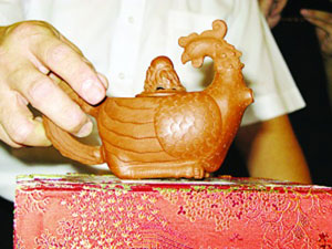 在南博,來自臺(tái)灣成陽藝術(shù)文化基金會(huì)的宋信德先生小心地從一個(gè)錦盒中取出一件小巧的紫砂壺,壺蓋上像有個(gè)雞頭的造型,他說這把壺稱作“鳳凰壺”,壺身雕刻了祥云托珠的造型。宋先生說,1721年德國德里斯頓博物館的登記冊中能找到與之相同的壺,證明是康熙年間造的。他又拿出另一件鏤空的“梅花紋紫砂圓壺”說,歐洲人有在高檔工藝品上鑲金屬的習(xí)俗,這把鏤空梅花紋紫砂壺的壺嘴、壺紐和座子上都加鑲了金飾,紐的金飾為梅花形,使紫砂壺在典雅中透出華麗,既美觀又耐用。這批展品都是從海外的大型拍賣會(huì)上重金購得的。