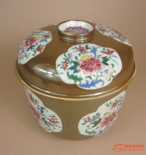 清雍正 超大號(hào)醬釉開光粉彩花卉大蓋盆
