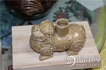 獅子如果發(fā)福了會(huì)是什么樣子?在甌窯陶瓷藝術(shù)研究所里,記者就看到這樣一只“發(fā)福”的獅子,胖嘟嘟的獅軀披著一層淡淡的黃褐色釉彩,配上短而肥的四肢,形象憨厚可愛(ài)。特別是那柄留在豐碩屁股上的一小圈尾巴,怎么看都不像是孔武有力的獅尾,更像是一只卡通豬身上打圈圈的尾巴,很難讓人感覺(jué)獸王的威嚴(yán)與強(qiáng)悍。然而說(shuō)起這只“發(fā)福”獅子背后的故事,卻不得不讓人大吃一驚。這是一件西晉甌窯青釉獅形燭臺(tái)仿品,其真品現(xiàn)珍藏于溫州博物館,距今已有1700多年歷史,論工藝成熟年限,眼下受人追捧的青花瓷只能算是它的“徒子徒孫”輩。