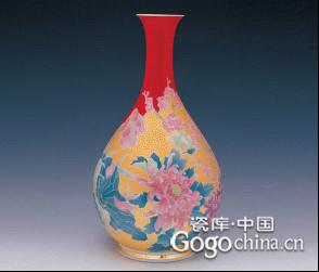 圖:瓷器禮品·中國(guó)紅金鑲玉四季祥和荷花牡丹玉壺春花瓶