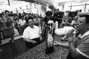 鑒寶在下午1點(diǎn)準(zhǔn)時(shí)開始,市民一邊小心翼翼的保護(hù)著自己的寶貝,一邊認(rèn)真的聽專家對(duì)其他藏品的點(diǎn)評(píng),寶劍、佛像、古字畫、青花瓷……種類真是不少,但精品不多。直到89號(hào)江先生的出現(xiàn),吸引了現(xiàn)場(chǎng)所有人員的目光,其持有的羊脂玉吊瓶,被專家鑒定為明代時(shí)期玉雕大師陸子岡的真品,材質(zhì)為一級(jí)羊脂玉,兩者占一就價(jià)格不菲,但其和二為一,當(dāng)世少有,現(xiàn)價(jià)值應(yīng)在1000萬元以上,是名副其實(shí)的長(zhǎng)春民間國(guó)寶,而其另一件紫砂藏品為顧紹培所制,曾經(jīng)在德國(guó)獲得過金獎(jiǎng),價(jià)值也在100萬以上,江先生的出現(xiàn),無疑引爆了中海·紫御華府的銷售中心。更讓評(píng)委驚訝的是,江先生在21日又到了鑒寶現(xiàn)場(chǎng),而且這天拿來的寶貝更是國(guó)寶級(jí)的,據(jù)專家介紹,此寶貝全名為法國(guó)銅鎏金銅球壓力鐘,是法國(guó)進(jìn)貢給清政府的貢品,一大一小,價(jià)值在500萬元以上。