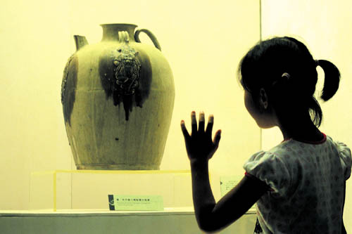一個小女孩在杭州南宋官窯博物館參觀“長沙窯大執(zhí)壺”。 新華社發(fā)