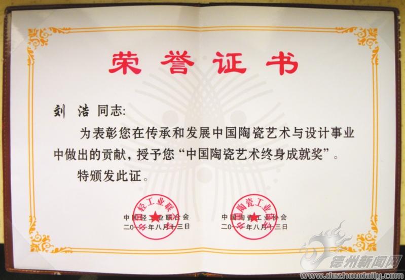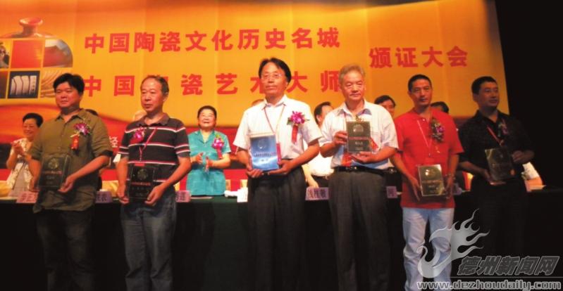 8月13日,由中國(guó)輕工業(yè)聯(lián)合會(huì)、中國(guó)陶瓷工業(yè)協(xié)會(huì)聯(lián)合舉辦的“中國(guó)陶瓷文化歷史名城和中國(guó)陶瓷藝術(shù)大師頒證大會(huì)”在北京釣魚臺(tái)國(guó)賓館舉行。會(huì)上頒發(fā)了“中國(guó)陶瓷文化歷史名城”、第二屆“陶瓷藝術(shù)大師”以及“中國(guó)陶瓷藝術(shù)終身成就獎(jiǎng)、特別貢獻(xiàn)獎(jiǎng)”獎(jiǎng)項(xiàng)。國(guó)家領(lǐng)導(dǎo)人周鐵農(nóng)、顧秀蓮等為獲獎(jiǎng)?wù)哳C獎(jiǎng)。我市著名陶藝大師劉浩先生獲得“中國(guó)陶瓷藝術(shù)終身成就獎(jiǎng)”榮譽(yù)稱號(hào)。
