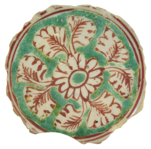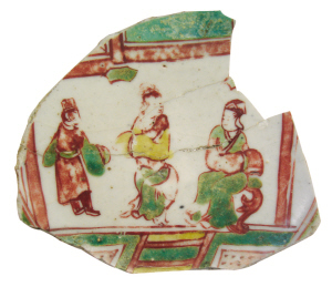 瓷器上的紋飾是那個時代的宣傳載體。手頭上有兩塊紅綠彩殘片,都是明代弘治、正德年前后的。這兩片都透露了那時的信仰和崇尚。圖1是紅綠彩孔明碗的碗心,圖2也是塊紅綠彩碗心,碗底有一個梵文字(圖3),分別傳遞出儒家思想和佛家思想。圖1畫著三個身著儒服的人,畫意應該是“三人行必有我?guī)?rdquo;。圖中的這三個人好像是孔子、子貢和顏回。子貢對孔子說,我只能“聞一而知二”,顏回卻可以“聞一而知十”?鬃诱f:“弗如也。吾與汝弗如也。”