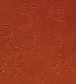 此壺為香港宜興老紫砂協(xié)會(huì)藏品,形制為傳統(tǒng)的龍蛋形,通高10.5厘米,寬12.5厘米,底銘“皎皎秋中月,大彬”。最早記載龍蛋壺的為清康熙、吳鼎梅《陽羨茗壺賦》:“圓者如丸,體稍縱,為龍蛋。”其胎質(zhì)為老朱砂泥,整器純以“打身筒”成形,砂質(zhì)粗礦,制作原始,器表砂孔粗,密度大,但透氣性好,外表修飾略為講究,但壺里粗糙可見,泥片曾用木板拍打促使泥胎緊密結(jié)合,并清晰看到身筒手工接片于流口處,指紋摁壓印極為明顯,壺內(nèi)壁觸摸薄厚不勻,典型的早期制壺風(fēng)格,是研究早期老壺成型工藝的很好教材。