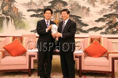 8月24日,韓國(guó)京畿道知事金文洙率17市市長(zhǎng)參加在濟(jì)南召開的“山東—京畿友城聯(lián)合體大會(huì)”,山東省長(zhǎng)姜大明將一件產(chǎn)自淄博的瓷器贈(zèng)予金文洙知事。