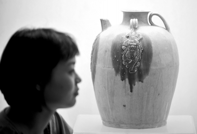 8月23日,一位參觀者正在杭州南宋官窯博物館參觀正在展出的長沙窯人物貼塑大執(zhí)壺。該壺由于器物尺寸大、存世少,俗稱“壺王”。近來,著名陶瓷鑒定專家、故宮博物院研究員楊靜榮通過媒體表示,從多個角度判斷該壺系仿品。8月23日,杭州南宋博物館接受新華社的獨家專訪,回應媒體和部分專家關于“壺王”的真假懸疑。南宋官窯博物館稱,被質(zhì)疑的長沙窯人物貼塑大執(zhí)壺來自安徽淮北民間收藏人士丁仰振2005年的捐贈,當年南宋博物館邀請張浦生、朱伯謙、馮小琦和朱戢等四位專家組成專家組,從丁氏提供的近千件器物中,集體選定了600余件,其中部分器物還經(jīng)過王莉英、李輝柄、李知宴、李廣寧和穆青等專家的集體鑒定。博物館稱,專家質(zhì)疑文物真?zhèn)沃皇且患抑,博物館將報上級文物主管部門對該壺及同一批征集文物再次進行鑒定。