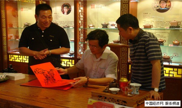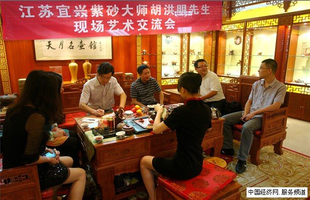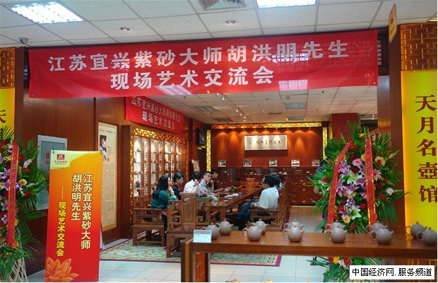 8月27日,由北京市天月茶超市舉辦的“江蘇宜興紫砂大師胡洪明先生現(xiàn)場(chǎng)藝術(shù)交流會(huì)”在馬連道茶城三樓天月茶超市隆重舉行。江蘇省工藝美術(shù)大師胡洪明、青年陶藝家胡迪鋒、北京天月盛世茶葉有限公司董事長(zhǎng)李曉毅等應(yīng)邀出席。下午3:00,交流簽售會(huì)開(kāi)始,先進(jìn)行大師、壺友互動(dòng)交流活動(dòng)。主辦方相關(guān)專業(yè)人士扼要介紹了當(dāng)前宜興紫砂發(fā)展的現(xiàn)狀以及紫砂收藏的前景,提醒在收藏、把玩紫砂壺時(shí)要注意的問(wèn)題。接著胡洪明大師就如何鑒賞、收藏紫砂壺回答了壺友提出的問(wèn)題,他特別提出紫砂壺有一般產(chǎn)品、工藝品和藝術(shù)品區(qū)別,壺友要多學(xué)習(xí)、多接觸,以提高鑒賞能力并根據(jù)自己的愛(ài)好、能力來(lái)藏壺、玩壺。不少的壺友還帶來(lái)了自己的藏品,讓大師鑒定、品評(píng),F(xiàn)場(chǎng)熱情的壺友紛紛選購(gòu)自己喜歡的紫砂壺并請(qǐng)大師簽名,合影留念。 在展廳一角,吸引了不少紫砂壺愛(ài)好者,他們邊欣賞,便提問(wèn),這種近距離的接觸,讓人們有機(jī)會(huì)更多的增加對(duì)紫砂藝術(shù)和茶文化的了解。