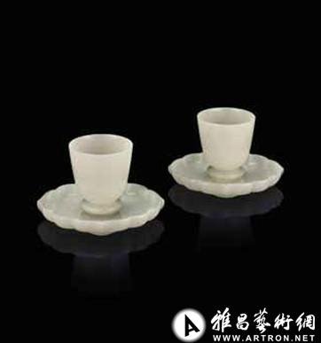 時(shí)至十八世紀(jì),好古慕雅之風(fēng)在清廷經(jīng)久不衰?涤焊扇⑹,君主皆汲汲于搜求古董文玩,對(duì)于用當(dāng)代材質(zhì)制成的仿古器物,他們亦青睞有加。拍品中有一對(duì)讓人贊嘆不已的白玉杯配花菱形盞托 (拍品1021號(hào)),其鐘型杯身光素?zé)o紋,乍看之下,似乎與仿古器物毫無關(guān)聯(lián)。其實(shí),其托盤精致的菱式造型,可上溯至漢代漆器及年代略晚的金銀器。眾多精品中,尚有一件較為明顯的仿古之作,即珍罕之至的黃玉仿古觥 (拍品1017號(hào))。玉匠采用了上乘的黃色美玉,并師法青銅器形,將之琢成古意盎然的玉觥。工匠已盡量避免在器身浮雕紋飾,藉以突顯石材的天然色澤。觥身唯一的裝飾是其精美的仿古卷草形柄,下承小巧玲瓏的仿古鳳凰,其蓋頂?shù)木聿菁y裝飾襯以螭龍。白玉仿犀角饕餮紋杯 (拍品1018號(hào)) 亦屬仿古器物,其構(gòu)思之妙讓人嘆為觀止。此杯形制敦碩,雕琢細(xì)膩,器身下半部狀似枝葉繁茂的卷草,造型儼若盞托。杯身大體光素,僅在器腰淺雕饕餮紋一匝?偟膩碚f,此杯糅合了仿古器物的兩大特征:其形制脫胎于古代角雕,而饕餮紋飾則是師法古青銅器。