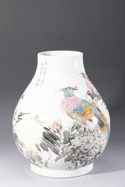 據(jù)工作人員介紹,這幅作品是手拉胚型,對(duì)技術(shù)要求很高,和這幅作品一樣,福泰藝術(shù)陶瓷的新產(chǎn)品都有力地佐證著福泰藝術(shù)陶瓷創(chuàng)新與研究的高起點(diǎn),在瓷種上燒成溫度達(dá)1400度的高白瓷及塑型極強(qiáng)手拉坯成型工藝等,再加上繪畫釉下青花、豆彩、釉下五彩、粉彩等工藝的運(yùn)用,實(shí)現(xiàn)了傳統(tǒng)工藝與傳統(tǒng)文化,現(xiàn)代工藝與現(xiàn)代文化的完美融合,形成福泰藝術(shù)陶瓷的一個(gè)最大亮點(diǎn)。