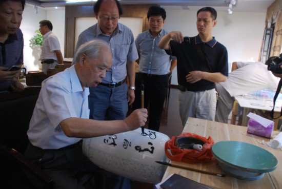 雖說年輕,但筆者和邵老也算是忘年交。一來二往,相識已有五六載,最近一次見面是在景德鎮(zhèn)的一次筆會上。一個耄耋之年的老人風塵仆仆從北京來到景德鎮(zhèn),自然不是旅游這么簡單。他雖說不是第一次來景,但和上一回也已相隔12年有余。若不是為家鄉(xiāng)淳安千島湖藝術館的開館進行陶瓷書法創(chuàng)作,邵老恐怕至今也無緣見到自己為景德鎮(zhèn)雕塑瓷廠大門題寫的“藝術瑰寶”四字。