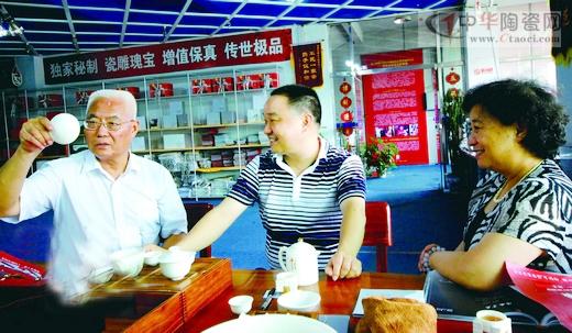 在中國(guó)白藝術(shù)宮品賞“仁海斗茶壺”時(shí),何天雄(左一)連聲贊嘆德化陶瓷把思想、內(nèi)涵、文化、藝術(shù)和智慧都融入到陶瓷藝術(shù)之中