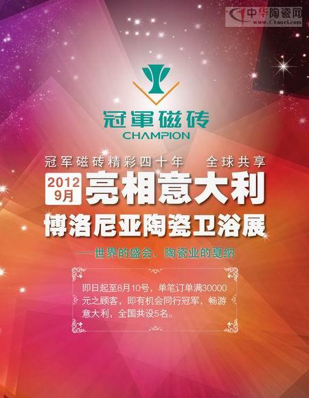 博洛尼亞盛會(huì)展出項(xiàng)目包含了歐洲衛(wèi)浴及磁磚行業(yè),為世界頂級(jí)品牌展示最新工藝和設(shè)計(jì)的舞臺(tái)。冠軍磁磚享譽(yù)華人瓷磚最為悠久的品牌歷史,此次榮登意大利陶瓷盛會(huì)殿堂,將具有絕對(duì)競(jìng)爭(zhēng)優(yōu)勢(shì)和多元化的高端產(chǎn)品呈現(xiàn)于此,不僅代表著中國(guó)陶瓷行業(yè)專注藝術(shù)創(chuàng)新和產(chǎn)品品質(zhì),真正的把中國(guó)瓷磚形象展現(xiàn)在世界舞臺(tái)上,還為中國(guó)瓷磚品牌逐鹿海外市場(chǎng)奠定了良好的基礎(chǔ)。使“冠軍”品牌在國(guó)際上熠熠生輝,成為中國(guó)人值得驕傲的品牌。