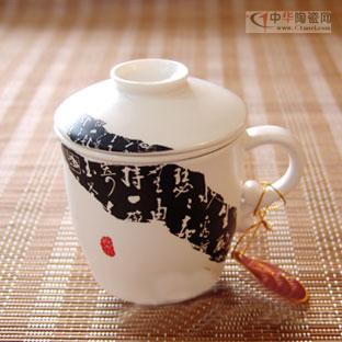 圖:德化陶瓷茶杯含過濾內(nèi)膽辦公三件套-韓日式杯