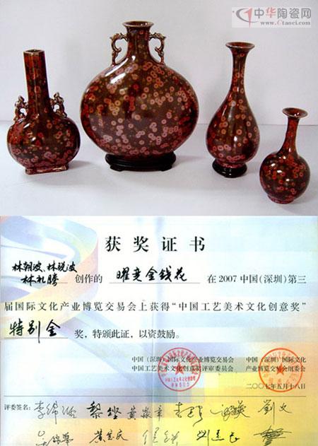 鐵銹紅釉、葵花天目釉、金銀圈、金錢花釉、玫瑰、三色環(huán)等高貴典雅、別具一格的新品,贏得了陶瓷美術(shù)界專家的高度評價,為大眾所青睞。其中“耀變天目金銀圈”于2005年第二屆中國陶瓷產(chǎn)品設(shè)計競賽榮獲金獎;葵花天目釉榮獲廣東省2006年陶瓷藝術(shù)創(chuàng)新設(shè)計大賽金獎、并在第三屆中國(深圳)國際文化博覽交易會中榮獲中國工藝美術(shù)文化創(chuàng)意獎特別金獎;《天目鐵銹紅釉20寸八寶瓶》和《耀變天目金銀圈瓶》收藏于中國北京中南海北區(qū)及國務(wù)院辦公廳;紅色耀變天目陶瓷制造方法及其使用的陶瓷釉已被國家知識產(chǎn)權(quán)局授予發(fā)明專利權(quán)。