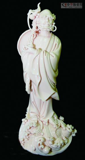《一葦渡江》,又名菩提達(dá)摩,是德化著名瓷雕藝術(shù)家陳其泰(1915-1995年)于上世紀(jì)80年代初創(chuàng)作的杰作。菩提達(dá)摩,意譯為覺法,于南朝梁武帝時(shí)期自印度航海到廣州,至南朝都城建業(yè)會(huì)梁武帝,面談不契,遂一葦渡江,北上少林寺,面壁九年,成為中國(guó)禪宗的始祖,被尊稱為“東土第一代祖師”。達(dá)摩的事跡隨著禪宗的發(fā)展,漸趨神異,并成為中國(guó)畫家、瓷藝家所愛的題材,明清德化窯達(dá)摩瓷塑就常以此為題材。陳其泰的渡江達(dá)摩神情威嚴(yán)而含蓄,身材偉岸,禪仗橫肩,左手輕托法水,赤足立于波濤之上,飄然過(guò)江,作品的衣紋線條雖簡(jiǎn),但流暢柔美,非常有概括力,人物形象神采畢現(xiàn),極具藝術(shù)美感。