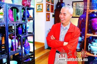 家住古鎮(zhèn)鎮(zhèn)的區(qū)均煥是中山市收藏家協(xié)會(huì)的副會(huì)長(zhǎng),涉足收藏已有近20年,如今經(jīng)營(yíng)著一家藝術(shù)品公司,在中山的收藏界也頗有名氣。在鑒寶類(lèi)節(jié)目大行其道的當(dāng)下,初入行的大部分收藏者紛紛沉溺于到古玩市場(chǎng)“淘寶”、鑒賞古董,不少人仍寄望于碰運(yùn)氣找到一件從遠(yuǎn)古流傳至今的寶貝,區(qū)均煥則專(zhuān)注于近代鈞瓷藝術(shù)品和寶玉石精品的收藏。