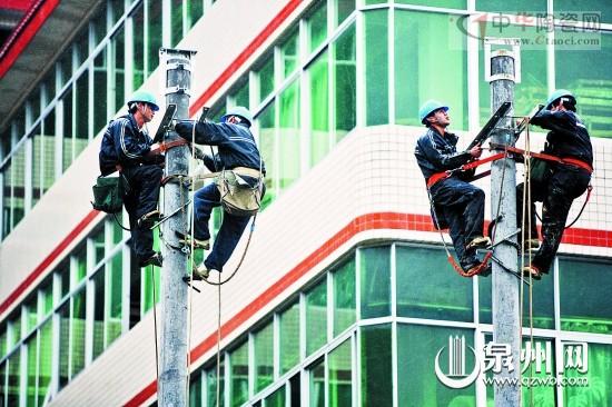 昨日清晨,電力工作人員已開(kāi)始施工。兩根12.5米高電線(xiàn)桿上,六名施工人員穿著“腳扣”在緊張施工。德化有1000多家陶瓷企業(yè),幾乎都用上電窯爐,而安裝公用配電變壓器,是為服務(wù)小型陶瓷企業(yè)。