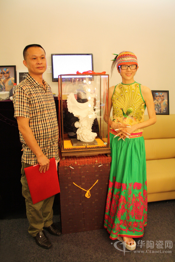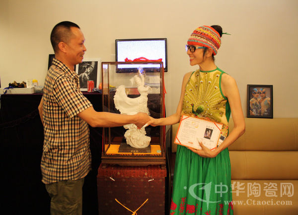 2013年6月10日,一場(chǎng)以瓷為舞的交流在廈門進(jìn)行,由福建省陶瓷藝術(shù)大師、高級(jí)工藝美術(shù)師蘇志強(qiáng)創(chuàng)作的德化陶瓷孔雀舞作品《雀之靈》贈(zèng)于“孔雀舞皇后”楊麗萍。現(xiàn)場(chǎng),楊麗萍對(duì)德化陶瓷的工藝及精細(xì)甚為贊嘆。