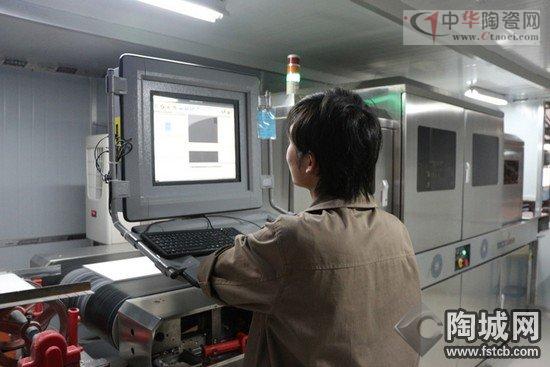 內(nèi)墻磚企業(yè)生產(chǎn)工人正在操作間內(nèi)觀察噴墨印花機(jī)工作狀態(tài)