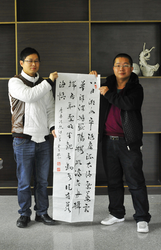 南安收藏家潘先生與德化年輕陶藝家王順合影 手簽精品<<知音>>
