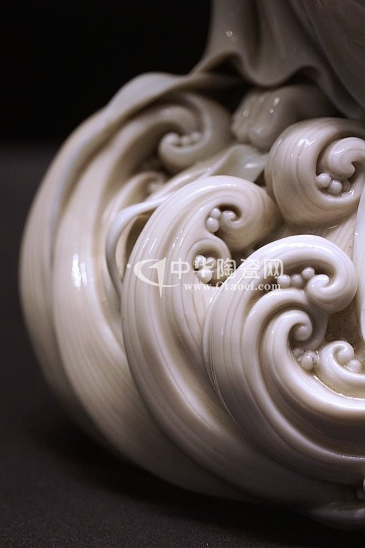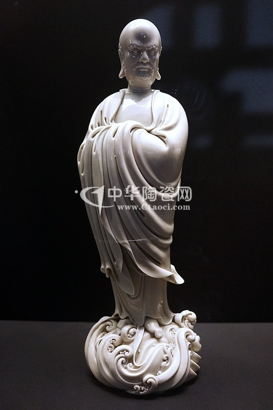 這件立像與其他德化窯瓷塑人物一樣,體量不大。但卻將波濤之上一葦渡江的達摩表現(xiàn)得維妙維肖。與同室展出的那些工藝繁復、技巧高超的當代佳作相比,何朝宗所作此像,在精準優(yōu)美的人物形象塑造和令人叫絕的衣紋水波再現(xiàn)之外,可能還是在精神面貌的刻畫上更勝一籌。正所謂——妙不可言。