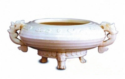 這件白釉瓷雙螭耳三足爐其造型與紋飾雖模仿商周青銅雙螭耳簋式三足爐形制,但形體軒昂,給人以穩(wěn)重勻稱、器型規(guī)整、線條柔和之美感。與古樸的銅雙螭耳簋式三足爐相比,另有一番典雅秀麗的韻味,具有異曲同工之精妙,使人觀之愛不釋手。白釉瓷雙螭耳簋式三足爐通體施乳白釉,于細(xì)膩潔白色中微微泛黃,瓷簋式爐外底露胎,胎潔白細(xì)膩,整件器物其裝飾在瑩潤的釉色中似隱似現(xiàn),既簡潔生動,又古樸典雅,給人以溫潤寧靜莊重的美感享受。由此可以看出:這件明代德化窯白瓷雙螭耳簋式三足爐,其瓷、胎、釉乃至裝飾藝術(shù)等都達(dá)到了很高的藝術(shù)境界,是一件難得的上乘藝術(shù)精品。