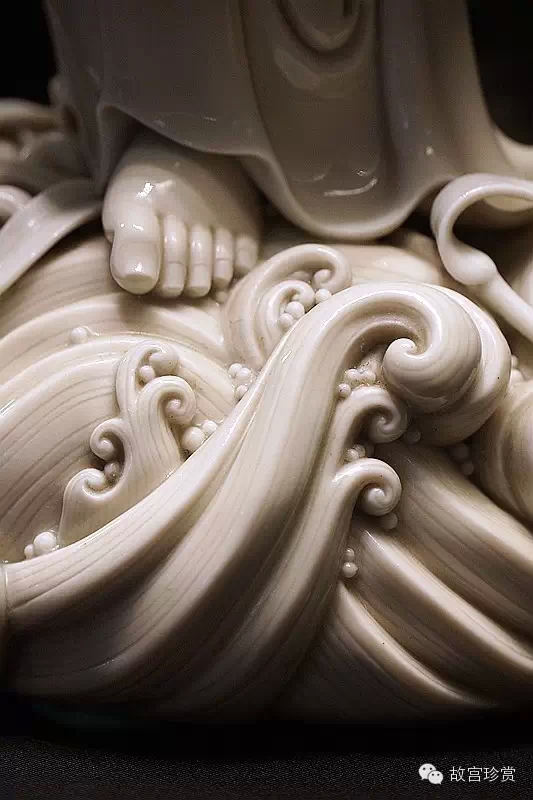 而何朝宗最為精彩的傳世瓷塑名作《達摩立像》,這件立像與其他德化窯瓷塑人物一樣,體量不大。但卻將波濤之上一葦渡江的達摩表現(xiàn)得維妙維肖。何朝宗所作此像,在精準優(yōu)美的人物形象塑造和令人叫絕的衣紋水波再現(xiàn)之外,正所謂——妙不可言。