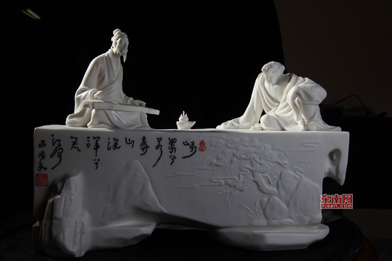 “抱琴觀鶴”,正是寄托了顏松柳在德化白瓷藝術(shù)道路上的不懈追求的情懷:無論是對何朝宗傳統(tǒng)的守望,還是創(chuàng)作符合現(xiàn)代審美情趣的作品,顏松柳一直致力于對德化瓷土泥性的挖掘,他希望,燒制的瓷塑作品,不僅閃爍著人性光輝,而且散發(fā)著文人情趣,猶如一曲古琴,繞梁三日,意味深長。