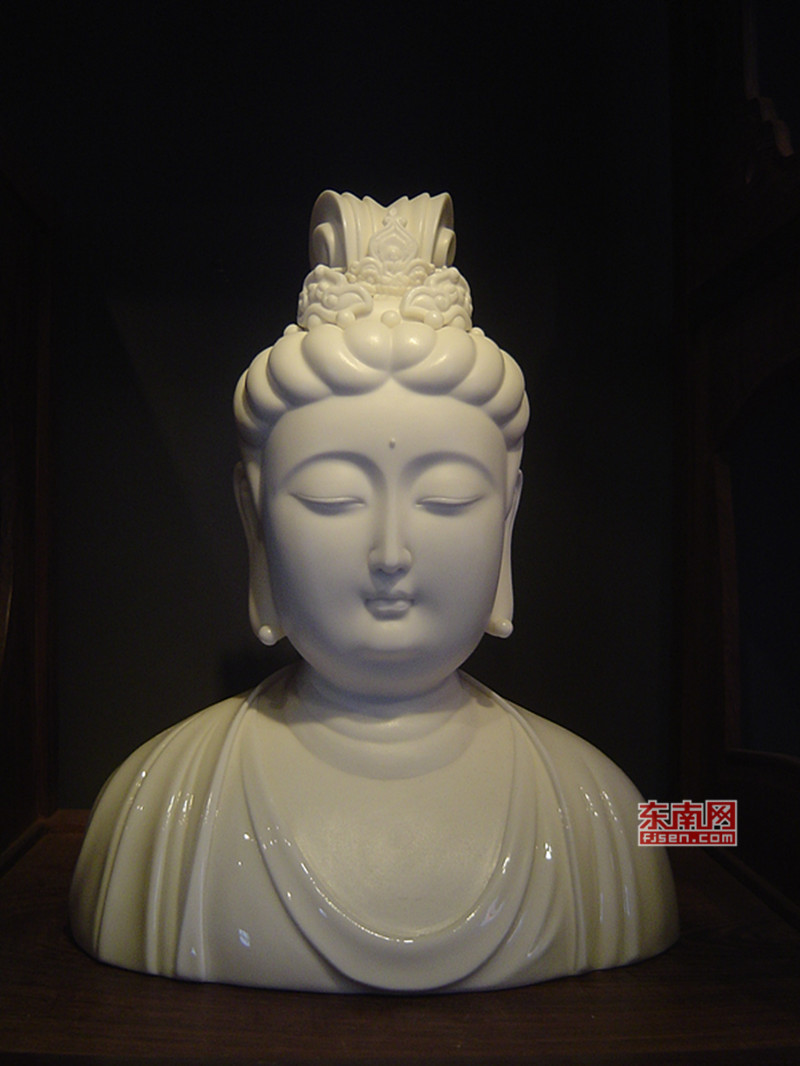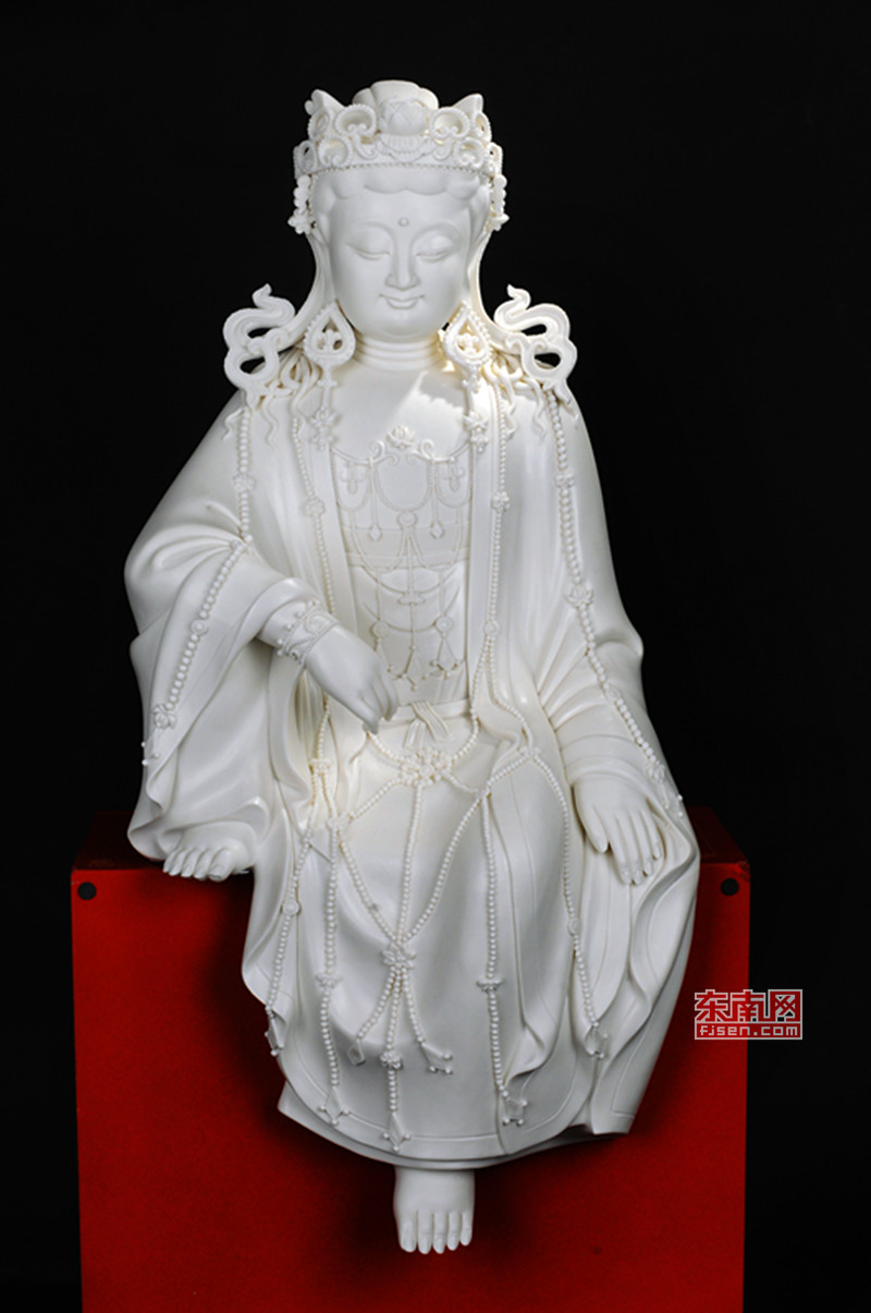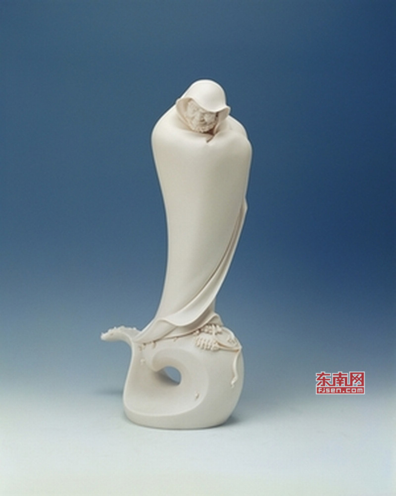 在他的理解里,德化陶瓷人物造像的開山宗師何朝宗著名的觀音作品,便是“閃爍著人性光芒”的經(jīng)典之作,最著名的《渡海觀音》,觀音將雙手優(yōu)雅地藏于衣袖之中,優(yōu)雅略帶著矜持,她雙目低垂,神態(tài)悠閑自在,臉上投射出恬靜柔美之光,如同古玉一般。
