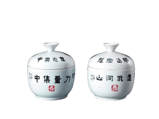 此次還有別出心裁的瓷器上印制著“意志集中、力量集中、節(jié)約救國、一心一意 共赴國難”等口號,據(jù)介紹這一部分有來自學校的教育創(chuàng)意,如一個花瓶上就書銘有大字醒目的“為國干城”以及“永春縣私立中小學第二屆運動會男子個人優(yōu)勝獎品”等字樣,將這含義深刻的花瓶作為學生體育競賽的獎品,教育鞭策學生奮發(fā)圖強、為國效力,做國家的捍衛(wèi)者,飽含著濃濃的保家衛(wèi)國、抗戰(zhàn)到底的民族情懷。
