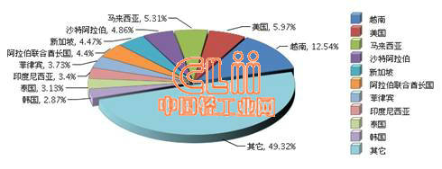 從出口增速看,對越南、阿拉伯聯(lián)合酋長國、美國、菲律賓出口額大幅增長,增速在30%以上。其中出口越南占比在上年度升至首位后繼續(xù)保持較快增長,占比較上年提高了4.36個百分點。對美國出口由上年第五升至第二,占比提高了1.62個百分點。而對馬來西亞、印度尼西亞出口同比下降,降幅分別為6.86%、27.18%,詳見圖2。