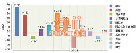 圖2 2015年1~12月我國陶瓷磚累計出口額主要貿(mào)易國同比增長情況