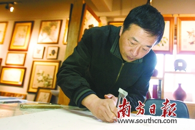 “從墨刻到宮廷畫、抽象畫,都是隨著理念在變,技法隨著想法而產(chǎn)生,逐漸實(shí)現(xiàn)產(chǎn)品的創(chuàng)新。”楊曉光說,手工雕刻不同于機(jī)器雕刻,它有人的激情、人的情懷在里面。“因此我一直認(rèn)為,技藝不重要,而是以創(chuàng)作理念為主。有了具象理念,就會(huì)產(chǎn)生很多種技藝,這是無窮的。比如能夠表達(dá)我繪畫語言的刀,有時(shí)候甚至可以用玻璃片、水果刀,工具是根據(jù)我的創(chuàng)作需要來定的,當(dāng)以前的技藝不能完成你現(xiàn)在的想法,你的工具、手法都可以變。”