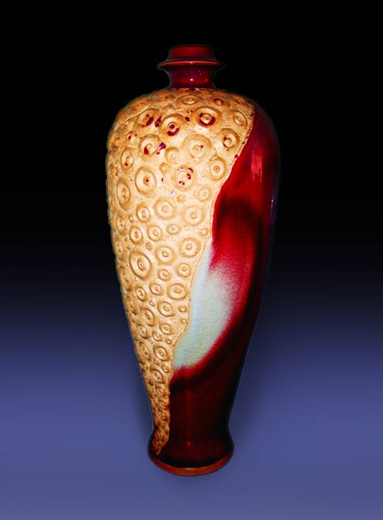 作品《腐》——選擇了比較現(xiàn)代的造型,這是劉志鈞初步接觸鈞瓷時(shí)內(nèi)心觀感的寫照。那時(shí)候還在鄭州大學(xué)新聞系教學(xué)的他,應(yīng)中國(guó)工藝美術(shù)大師劉富安的邀請(qǐng),成立了工作室?赡苁窃趯W(xué)院里沉浸已久的緣故,他對(duì)當(dāng)時(shí)神垕的鈞瓷產(chǎn)品滿是不屑,認(rèn)為它們太傳統(tǒng)、太守舊,甚至認(rèn)為它們舊得已經(jīng)腐朽了。由此,他產(chǎn)生了這樣的想法,以直觀的表現(xiàn)形式,載于傳統(tǒng)造型之上,隱喻其糟粕于身,于是就有了《腐》。他選了梅瓶——陶瓷傳統(tǒng)中極具代表性的造型,在其瓶身的一面,刻滿了“隕石坑”狀的形象代表“腐爛的膿皰”,而周圍的鈞釉代指“鈞瓷”。創(chuàng)作時(shí)他把主要功夫用在了雕刻上,僅淺浮雕部分就連續(xù)用了三天才刻成!陡返挠糜源竽,特別是紅、白、黃的搭配充滿想象力;色塊涇渭分明,具有極強(qiáng)的視線沖擊力。這件創(chuàng)作于20幾年前的鈞瓷處女作,表達(dá)了作者認(rèn)為“不變革,不創(chuàng)新,腐朽到頂,便將走入腐朽之路”的觀點(diǎn),也表明了他勇于顛覆傳統(tǒng)、追求藝術(shù)創(chuàng)新的“叛逆”立場(chǎng)。當(dāng)回想起堅(jiān)硬鋒利的修胚刀迅猛地從花瓶上掠過(guò)的時(shí)候,那些紛紛揚(yáng)揚(yáng)、如云似雪的瓷土,一定在劉志鈞內(nèi)心翻動(dòng)著很多五味俱陳的往事。我認(rèn)為,這是一個(gè)從理想主義走向現(xiàn)實(shí)主義,又從殘缺不全回歸逐漸完美的起點(diǎn),也是生生不息、生死循環(huán)的任性過(guò)程。“腐”開啟了劉志鈞鈞瓷的創(chuàng)作之旅,同時(shí)也喚醒了他一系列與云有關(guān)的藝術(shù)情懷。